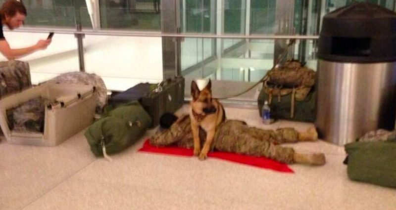 Співробітники аеропорту розповіли, що солдат був одним із членів групи з 10 військовослужбовців і двох службових собак. Невідомо, чи повернулися вони після виснажливого відрядження, чи тільки вирушали в нього, але всі явно потребували кількох хвилин відпочинку.