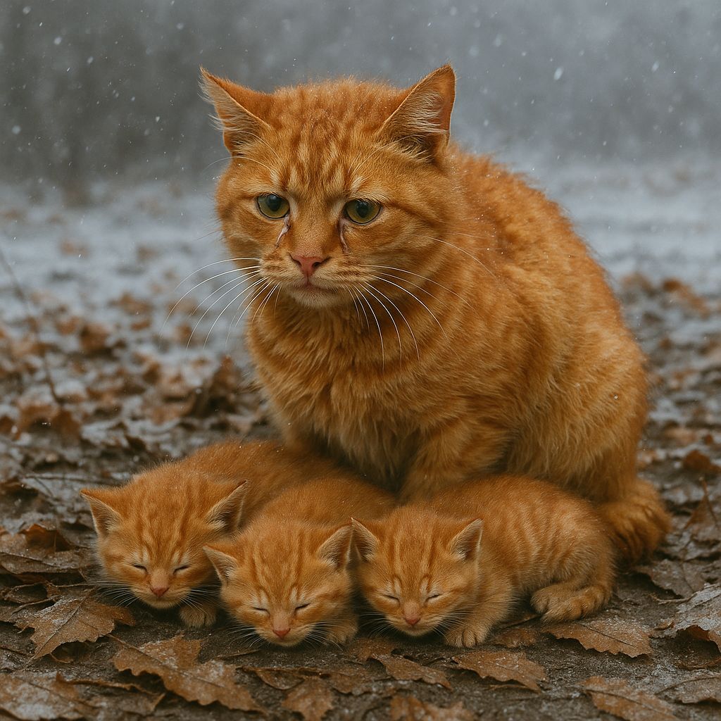 Олена Вікторівна обережно розсунула сухі гілки та опале листя, зазирнула в зів’ялі кущі. Там, просто на холодній підстилці з бурого листя, розгорнулася тяжка сцена: руда кішка сиділа, згорбившись, охороняючи крихітні тільця — троє кошенят не пережили крижану ніч.