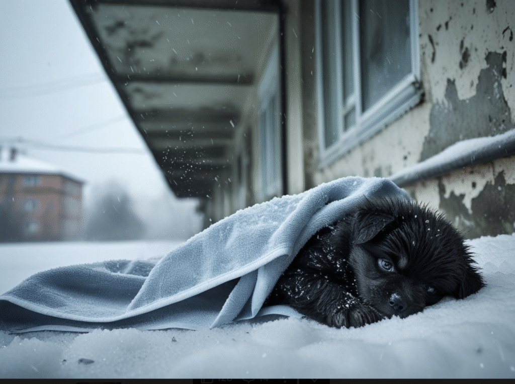 Прямо під балконом, притулившись до стіни, лежала темна грудочка. Спершу здалося — ганчірка або стара куртка, але вона ворушилася. Я придивилася — це був цуценя. Загорнутий у мокрий рушник, лежав на снігу й тремтів. Очі напіввідкриті, носик брудний, лапки злиплися в клубочок.