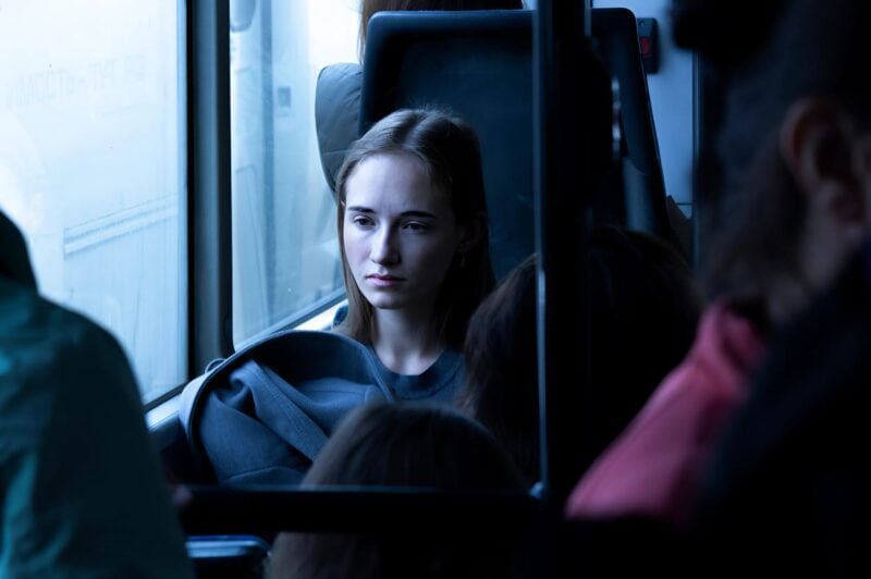 У кінці салону спала дівчина — юна, розтріпана, з великим рюкзаком і телефоном у руках. Спала по-справжньому: рот трохи відкритий, голова відкинута назад.